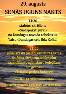 Nāc, piedzīvo un iededzies Baltijas jūras krastā par vienotību, par piederību savai tautai un novadam! Augusta pēdējās sestdienas vakars Baltijas jūras piekrastes ļaudis apvieno «Senās uguns naktī».