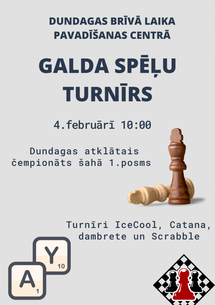 4. februārī plkst. 10.00 Dundagā, Brīva laika pavadīšanas centrā norisināsies galda spēļu turnīrs. Šajā dienā interesenti varēs pārbaudīt savus spēkus tādās galda spēlēs kā Catana, Ice Cool, Scrabble un dambrete.