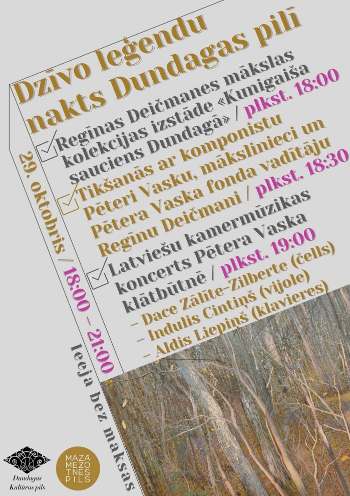 Ap plkst. 19.00 «Latviešu kamermūzikas koncerts Pētera Vaska klātbūtnē», Dace Zālīte-Zilberte (čells), Indulis Cintiņš (vijole), Aldis Liepiņš (klavieres).
