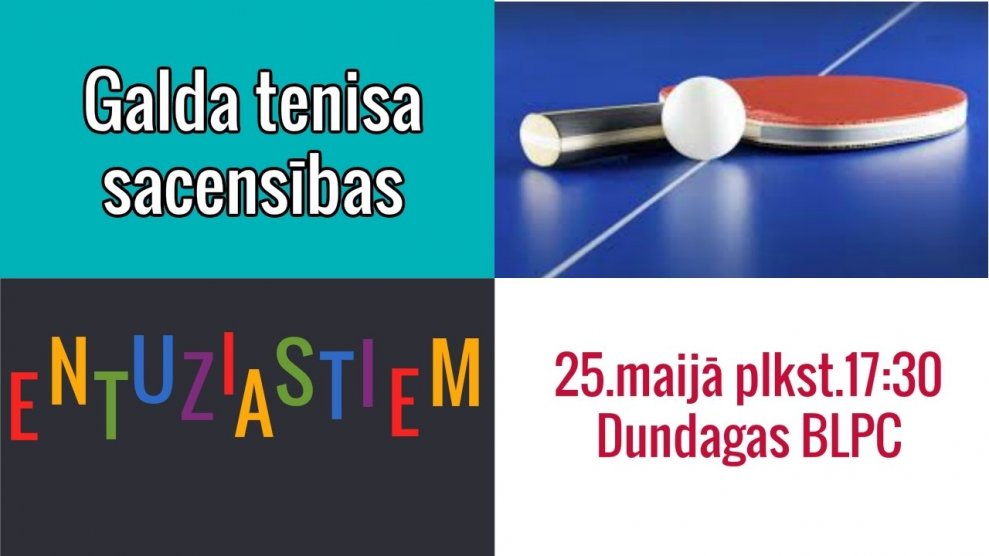 25. maijā plkst. 17.30 Dundagas Brīvā laika pavadīšanas centrā notiks galda tenisa sacensības entuziastiem.
