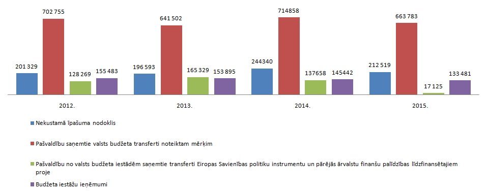 Plānotais iedzīvotāju ienākuma nodoklis 1 932 753 € ir par 19% lielāks nekā iepriekšējā gadā, savukārt ieņēmumi no finanšu izlīdzināšanas fonda ir 330 201 €, kas ir par 42% mazāk kā 2014. gadā. Papildus pašvaldība saņem valsts budžeta mērķdotāciju 102 244 €, lai nodrošinātu vērtētos ieņēmumus pēc pašvaldību finanšu izlīdzināšanas finanšu nepieciešamības neizlīdzināmās apakšējās robežas 99 procentu līmenī.