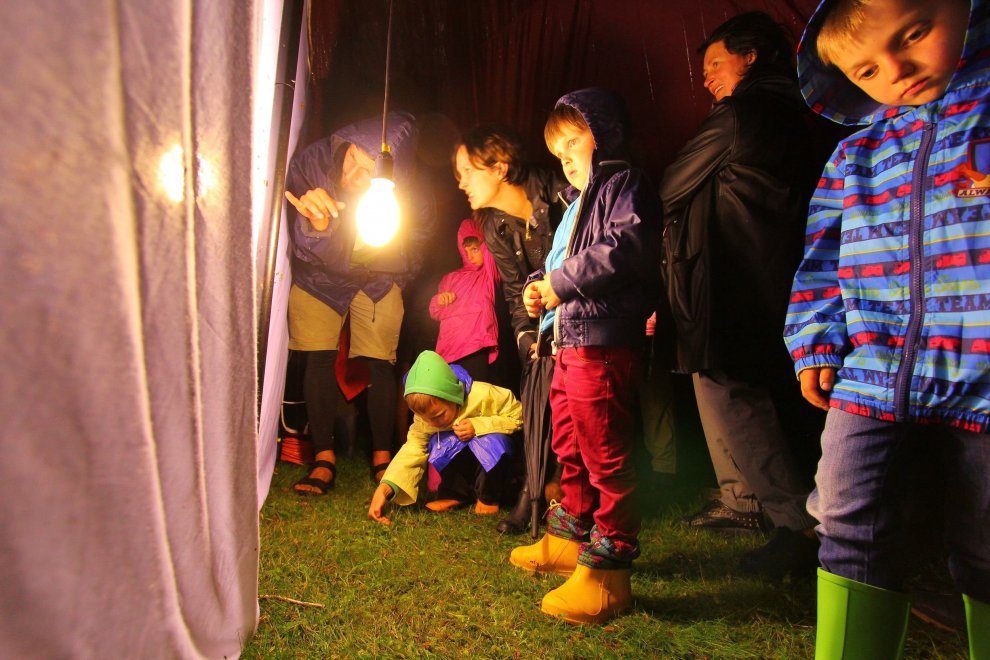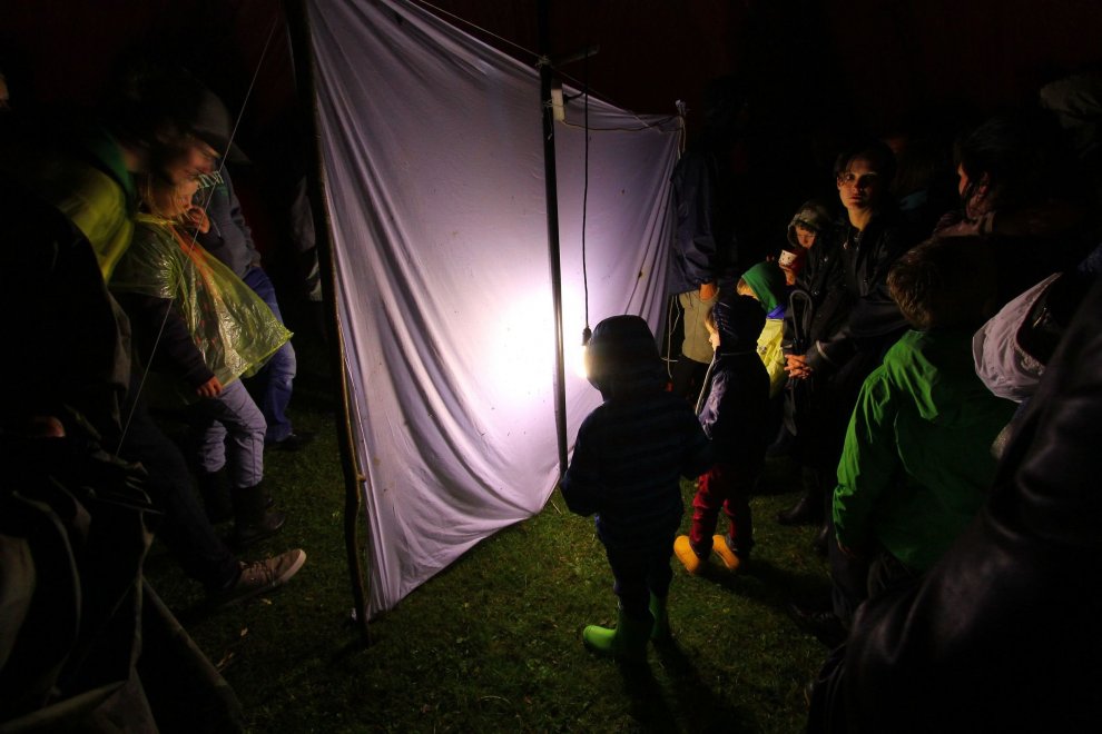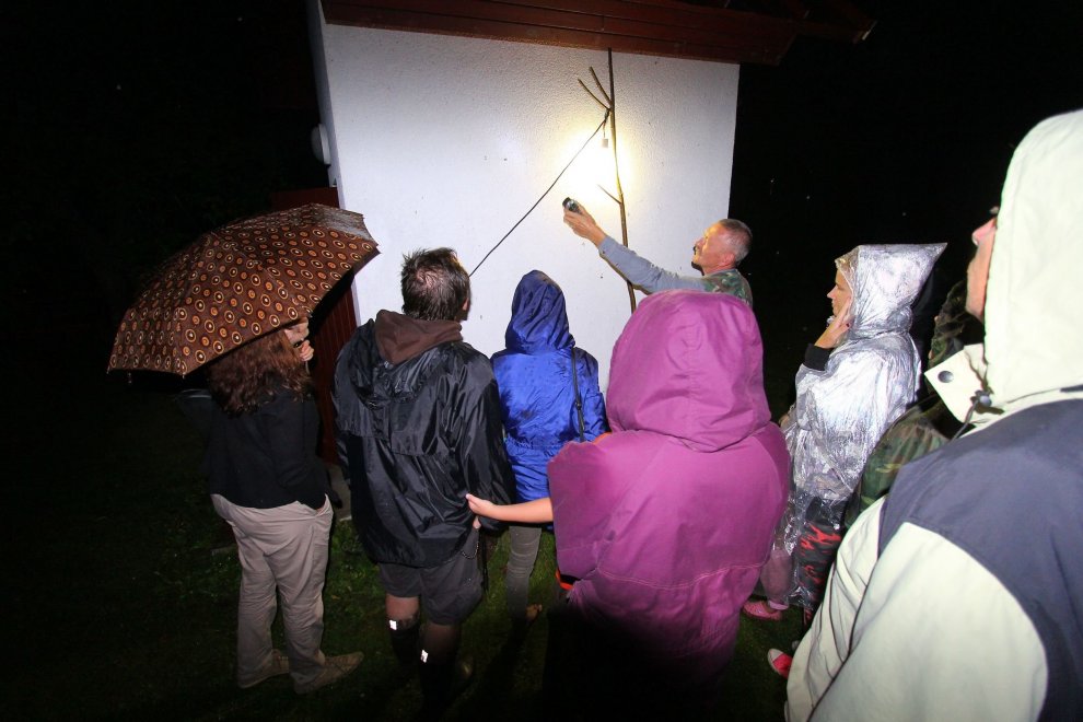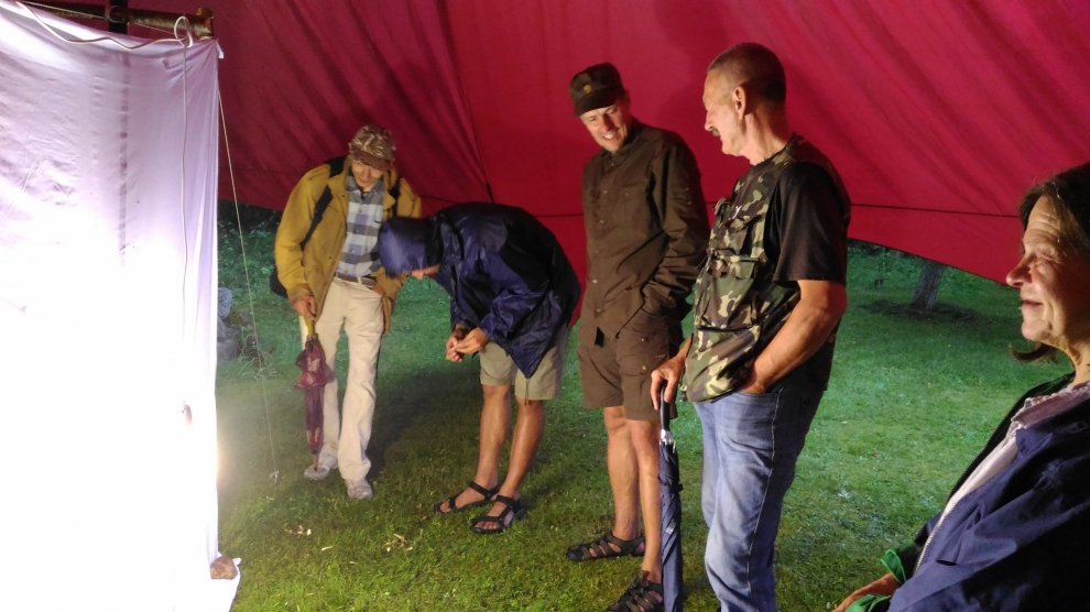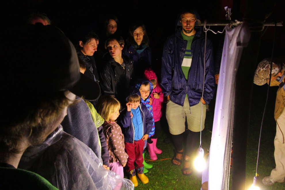 Tas nekas, ka lija — jau krēslā ļaudis un kukaiņi pulcējās dabas izglītības centrā «Slītere», pie Šlīteres bākas. Siltais bezvēja vakars radīja citādu noskaņu nekā ierasts — klusinātu, mazliet mistisku, jo nakts ir tāds noslēpumains laiks. Entomologs, Latvijas Universitātes profesors Voldemārs Spuņģis un viņa kolēģis dabas pētnieks un fotogrāfs Uģis Piterāns šoreiz Šlīteres bākas telpās stāstīja un rādīja kukaiņu pasaules pārstāvju foto. Arī kukaiņiem bija uzcelta nojume ar tik vilinošajām lampām. Improvizēta laboratorija ar mikroskopu un kukaiņu kolekcijām bija iekārtota Ozola namiņā. Vienīgi ugunskurs lēni kūrās zem klajas debess, gaidot štokmaizes cepējus.