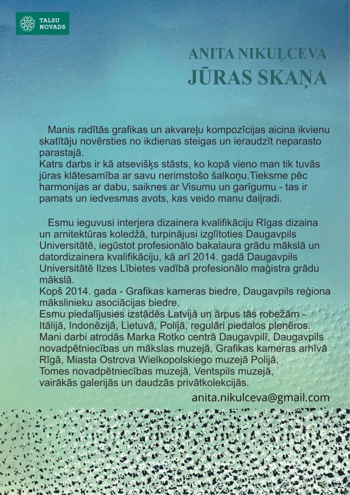 Mēs ļoti gaidām Jūs, lai kopā dotos mākslinieciskajā ceļojumā, izpētot Anitas Nikuļcevas darbus un atklājot akvareļu krāsu burvību.