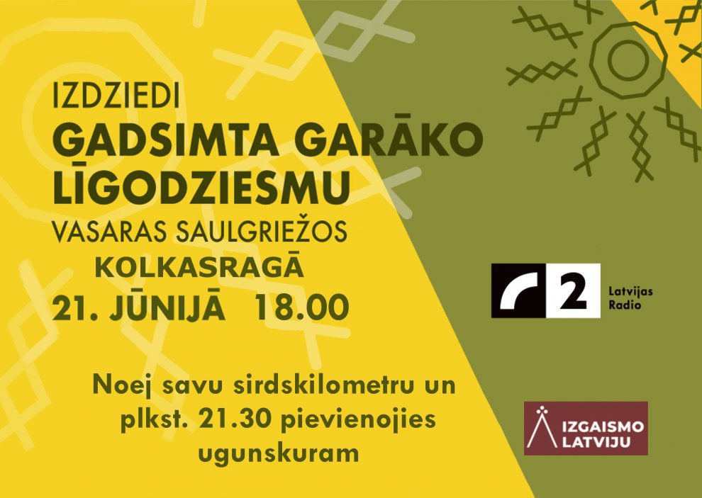 21. jūnijā Latvijas apiesim apkārt Latvijai un pulcēsimies pie ugunskuriem Latvijas pierobežā — no plkst 18.00 Kolkasragā izdziedi gadsimta garāko Līgodziesmu kopā ar Kolkas lībiešu ansambli Laula un akcijā «Izgaismo Latviju» noej savu Sirdskilometru un pievienojies ugunskuram plkst 21.30!