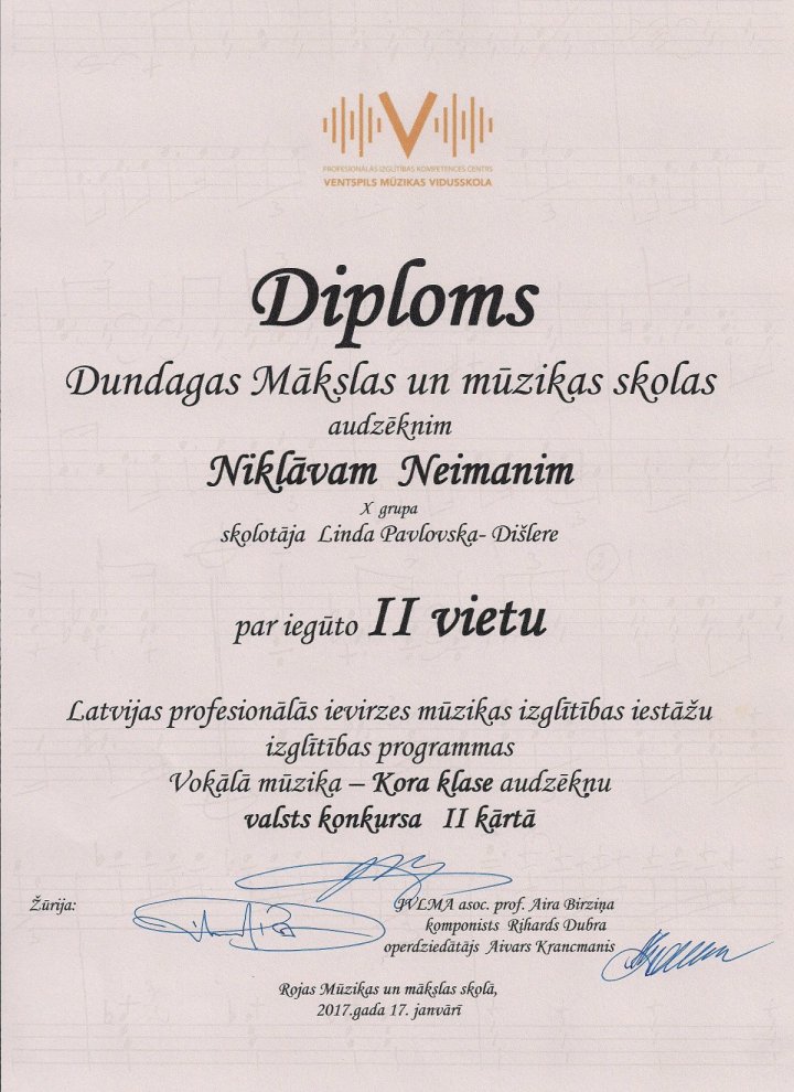 17. I Rojas mūzikas skolā notika Latvijas profesionālās ievirzes mūzikas izglītības iestāžu izglītības programmas «Vokālā mūzika — Kora klase» audzēkņu valsts konkursa II kārta. Mūsu skolu pārstāvēja skolotājas Lindas Pavlovskas-Dišleres audzēknis Niklāvs Neimanis, koncertmeistare Daiga Rūtenberga, un Inoras Sproģes audzēknis Martins Markuss Lorbergs, koncertmeistare Dace Šmite.