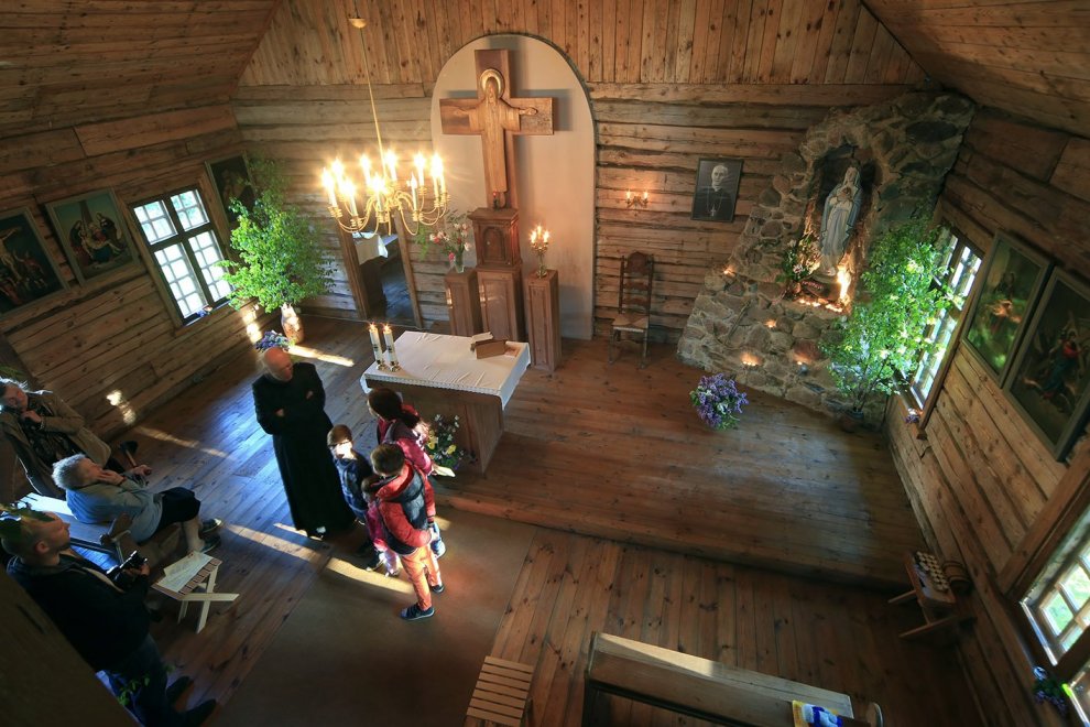 Vispirms iegājām katoļu baznīcā. Nu pasakaini! Koka baznīca. Maza, mīlīga, krucifikss priekšā. Bērzu meijas kā Vasarsvētkos! Salasīti lauku ziedi. Priesteris bija tāds patīkams. Apģērbs jau viņam bija interesants, tas viss spīdēja un laistījās. Viņš noturēja dievkalpojumu. Cilvēki bija sanākuši, bērni sēdēja pirmajos solos. Dievkalpojums ilga gandrīz divas stundas. Par šo baznīcu un priesteri palika ļoti labs iespaids.
