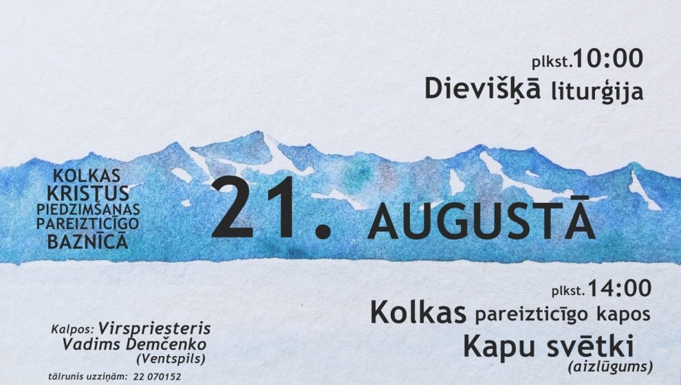 21. VIII plkst. 10.00 Kolkas Kristus piedzimšanas pareizticīgo draudzē dievišķā liturģija. Kalpos virspriesteris Vadims Demčenko (Ventspils).
