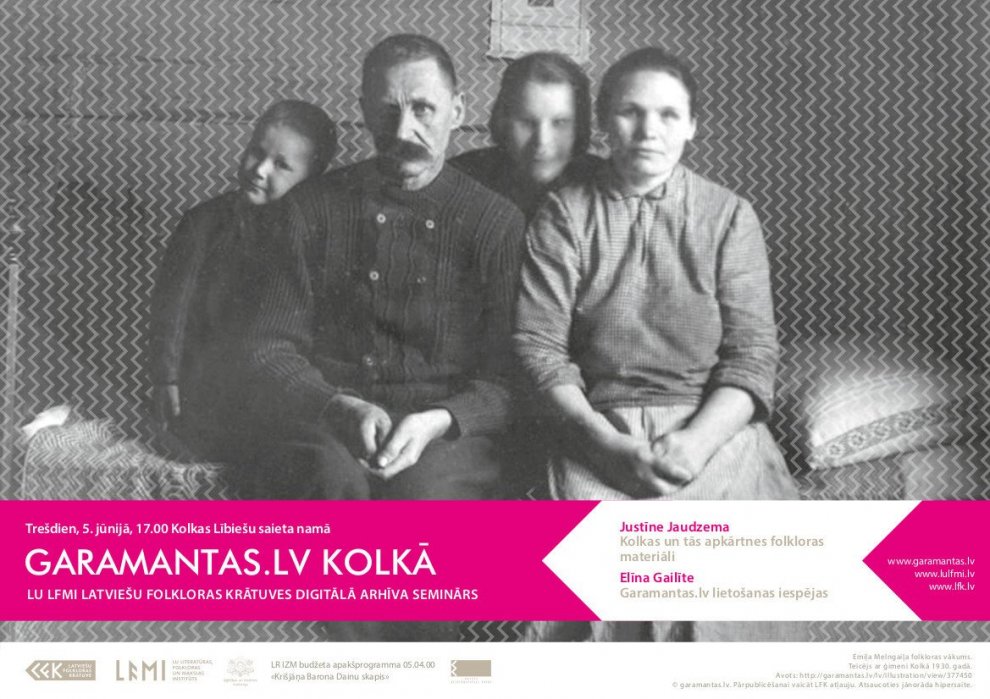 5. jūnijā seminārā garamantas.lv redaktores – Elvīra Žvarte un Justīne Jaudzema iepazīstinās interesentus ar LFK digitālā arhīva izmantošanas iespējām, kā arī pastāstīs un parādīs, kādi Kolkas un tās apkārtnes materiāli atrodami Latviešu folkloras krātuvē. Piemēram, būs iespējams uzzināt par Kolkas pamatskolas skolēnu vākumu, kurš iesniegts 1930.gadā, kā arī par 1961. un 1962. gadā notikušajām zinātniskajām ekspedīcijām un to laikā pierakstītajiem materiāliem.