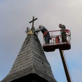 Izmantojot specializētā transporta-pacēlāja pakalpojumus, draudzes locekļiem bija iespējams piekļūt zvanu torņa smailei, lai vizuāli iztaisnotu un nostiprinātu dekoratīvo kroni zem krusta.