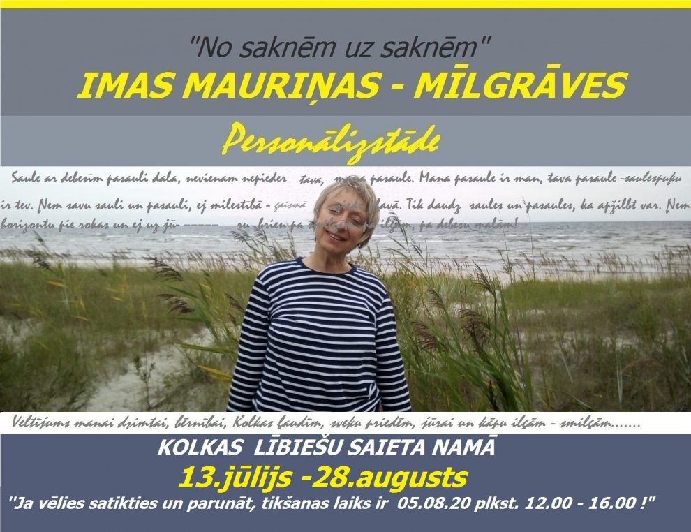 No 13. jūlija līdz 28. augustam Kolkas Lībiešu saieta namā apskatāma Imas Mauriņas-Mīlgrāves personālizstāde «No saknēm uz saknēm».