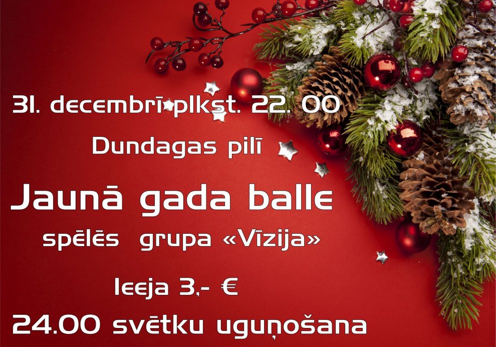 31. XII plkst. 22. 00 Dundagas pilī Jaunā gada balle. Spēlēs grupa «Vīzija». Ieeja 3 €. Plkst. 24.00 svētku uguņošana.
