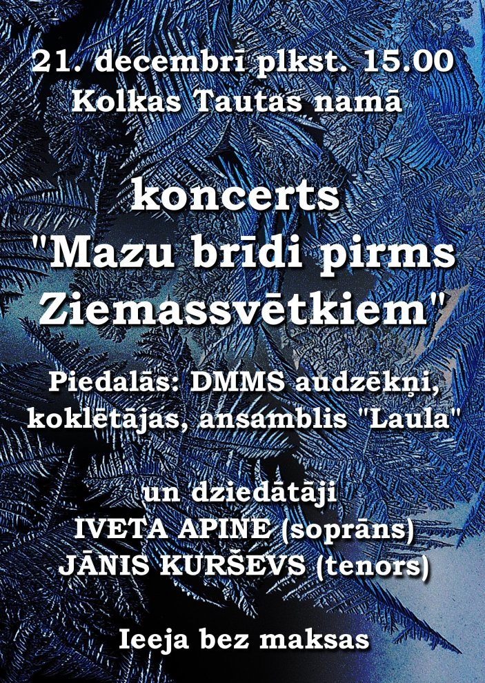 21. decembrī plkst. 15.00 Kolkas Tautas namā koncerts «Mazu brīdi pirms Ziemassvētkiem».