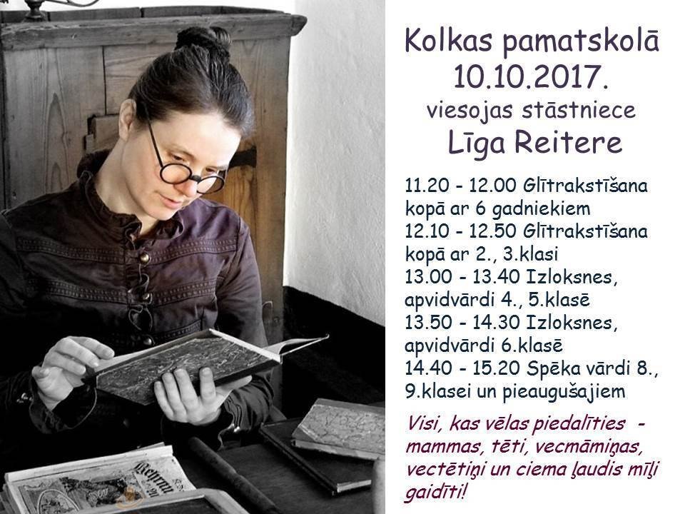 10. oktobrī Kolkas pamatskolā viesojas stāstniece Līga Reitere.