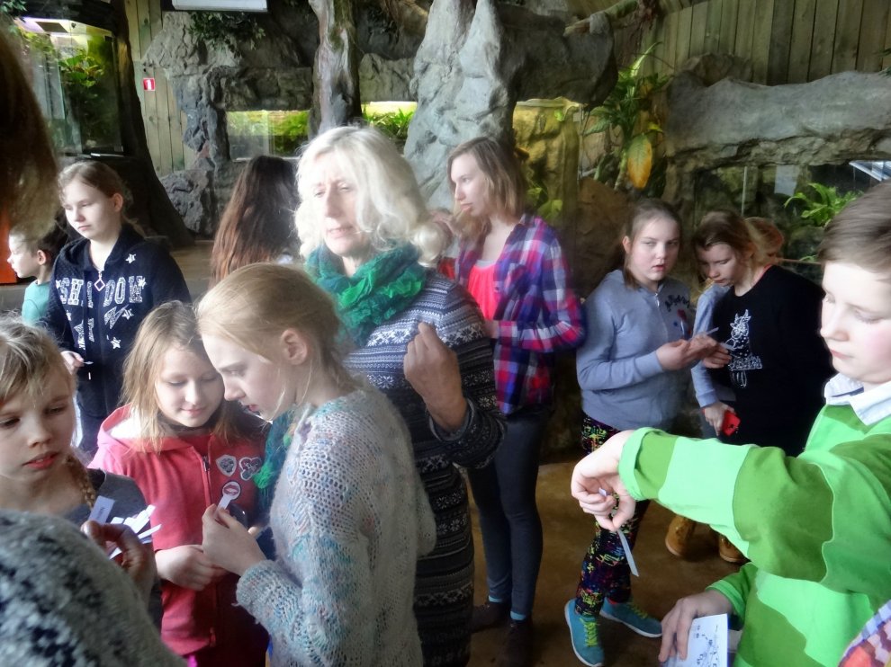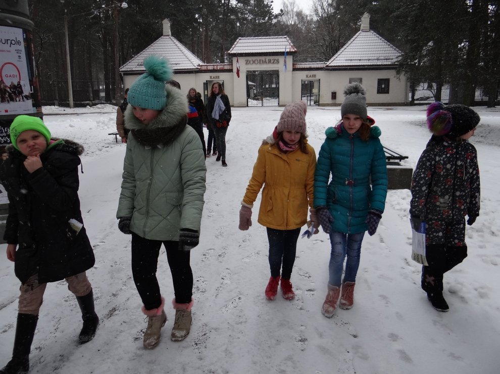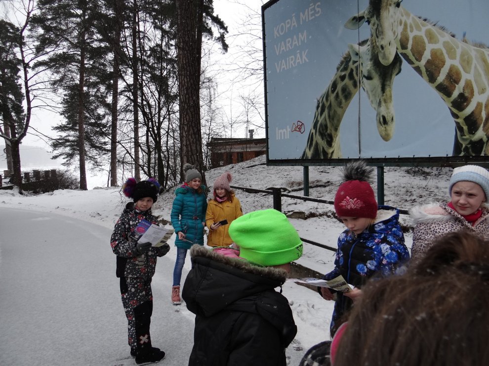 Paveikuši pirmo uzdevumu, devāmies ekskursijā pa zoodārzu. Sastapām kamieļus, vientuļās bites iemigušas savā mājā, pūces un pat tīģeri, arī šos zvērus netraucē sniegs un ziemas aukstums. Tomēr mēs gan priecājāmies par iespēju sasildīties flamingo, terārijā, tropu un žirafu mītnēs. Gide stāstu par dzīvniekiem noslēdza ar uzdevumu — no dzīvnieku un augu nosaukumiem izveidot savstarpēji saistītas sistēmas, parādot, ka ikviens uz zemes tauriņš, kukainis, dzīvnieks vai augs sadzīvo ar citiem un viens bez otra nevar iztikt.