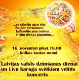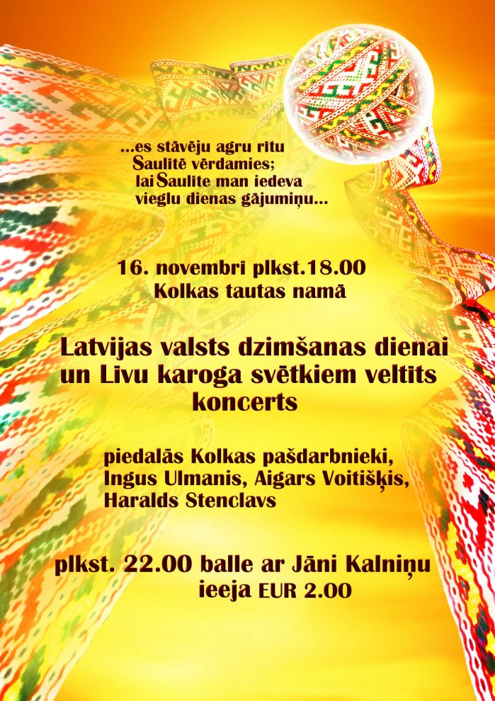 16. XI plkst.18.00 Kolkas tautas namā Latvijas valsts dzimšanas dienas un Līvu karoga svētku koncerts.