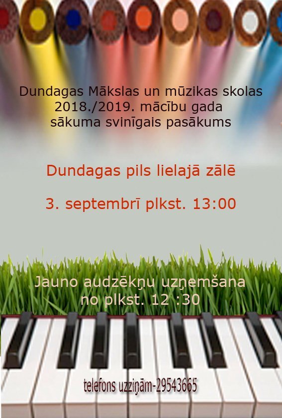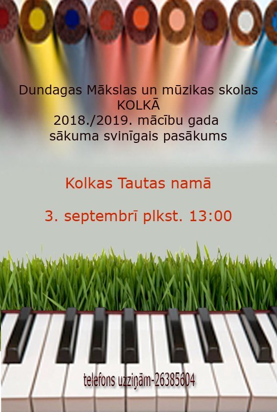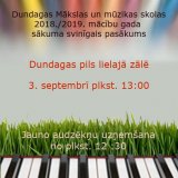 Dundagas Mākslas un mūzikas skolas 2018./19. mācību gada sākuma svinīgais pasākums Dundagas pils lielajā zālē 3. septembrī plkst. 13.00, Kolkā — Kolkas Tautas namā 3. septembrī plkst. 13.00.