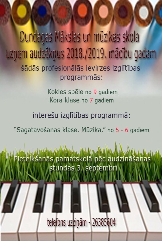 Dundagas mākslas un mūzikas skola uzņem audzēkņus 2018./19. mācību gadam mācībām Kolkā šādās profesionālās ievirzes izglītības programmās: