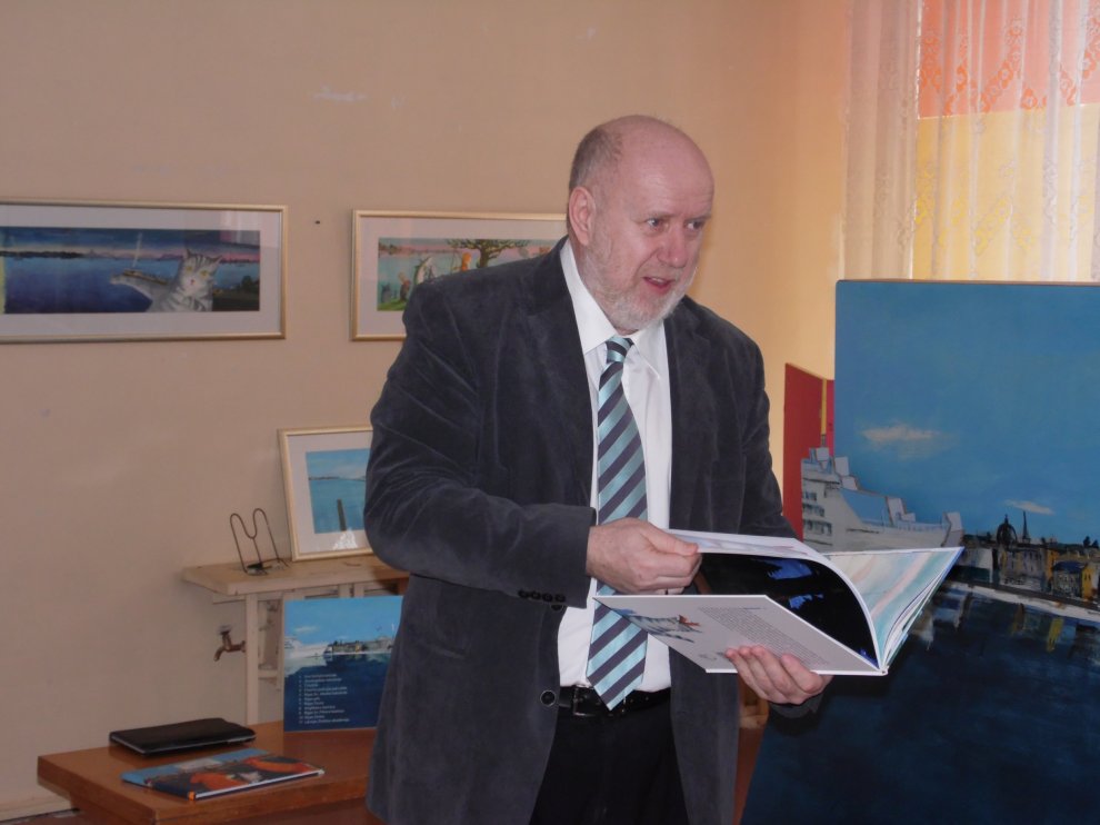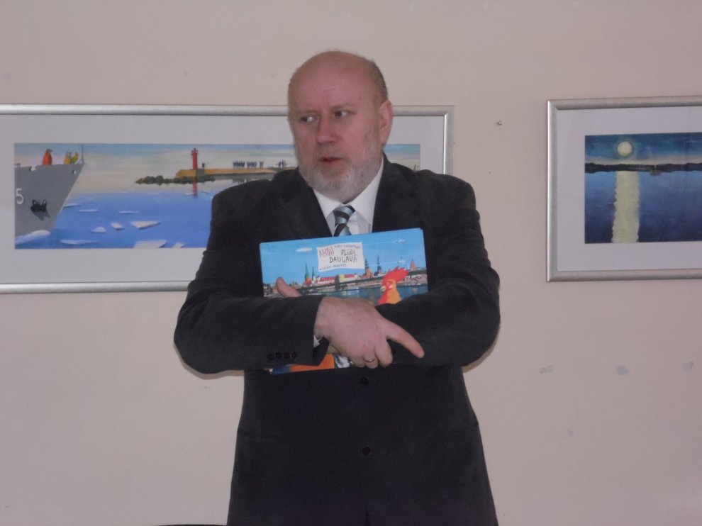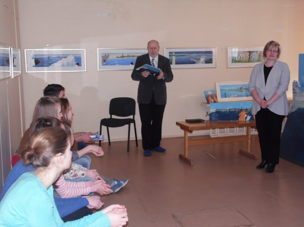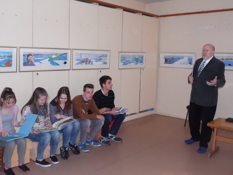 Esam jau rakstījuši par Jura Zvirgzdiņa grāmatas «Ahoi! Plūdi Daugavā» ilustrāciju izstādi Dundagas bibliotēkā, kas aplūkojama līdz mēneša beigām. 20. IV vidusskolas audzēkņiem un vizuālās mākslas skolotājai Sandrai Bražei bija iespēja tikties ar ilustrāciju autoru, profesoru Alekseju Naumovu.