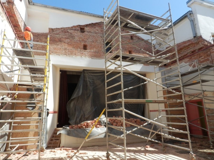 Vienlaicīgi notiek darbi Tautas nama zālē — ir pabeigts griestu klājums un pamazām notiek gatavošanās arī citiem iekštelpu darbiem.