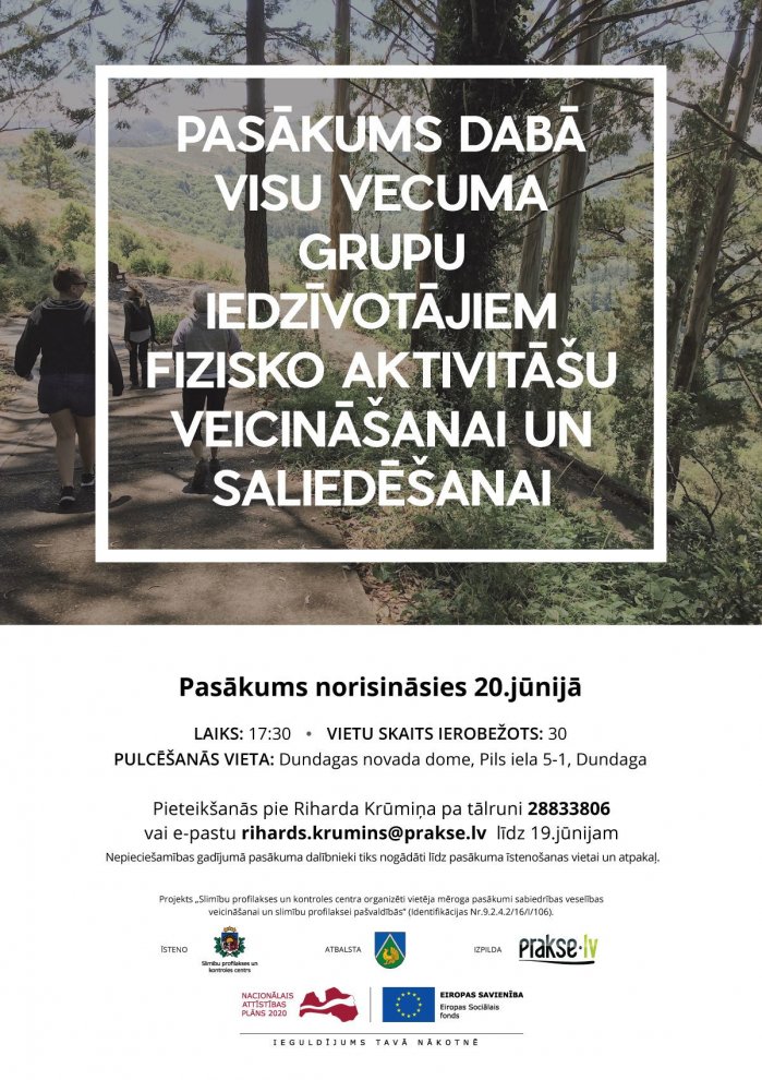 20. jūnijā plkst. 17.30 Slimību profilakses un kontroles centrs sadarbībā ar SIA «Prakse.lv» Dundagā aicina uz pasākumu visiem vecumiem fizisko aktivitāšu veicināšanai un saliedēšanai. Pulcēsimies pie domes ēkas Pils ielā 5 jeb «Līkās muižas»!