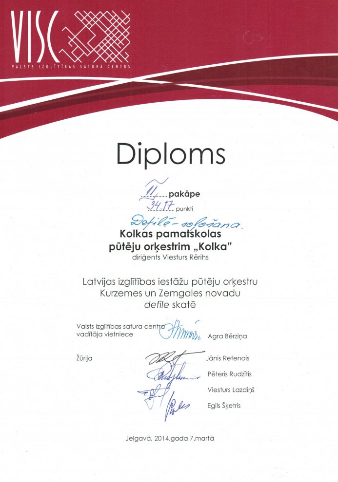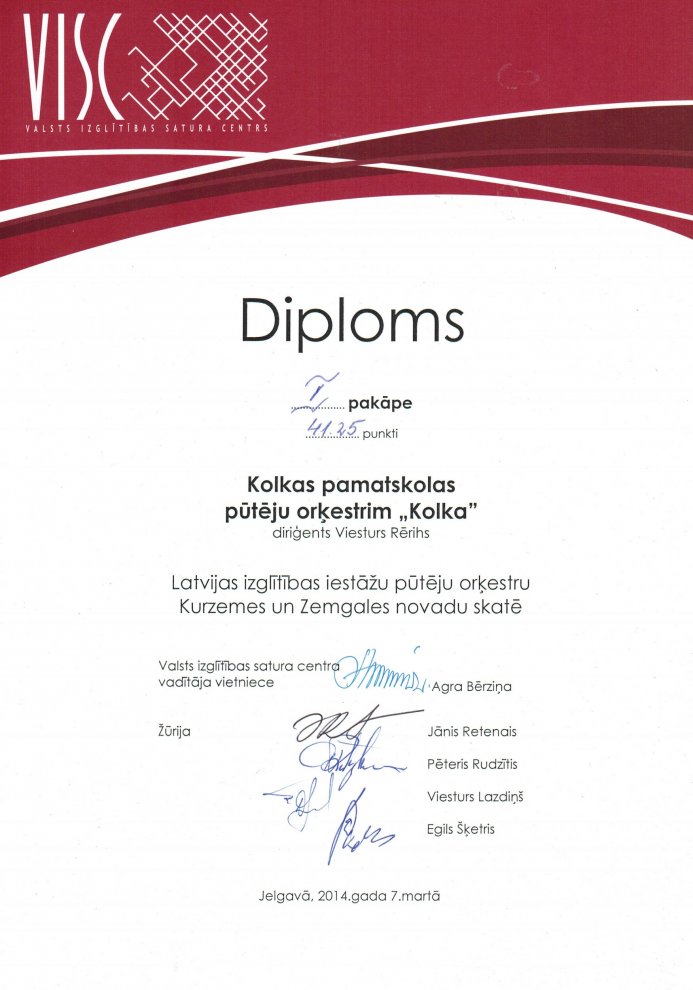 Pūtēju orķestrim «Kolka» I un II pakāpes diploms! 10.03.2014. plkst. 14.05