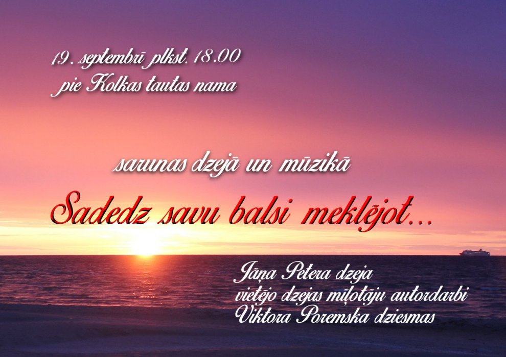 19. IX plkst. 18.00 pie Kolkas tautas nama sarunas dzejā un mūzikā «Sadedz savu balsi meklējot...» — Jāņa Petera dzeja, vietējo dzejas mīļotāju autordarbi, Viktora Poremska dziesmas.