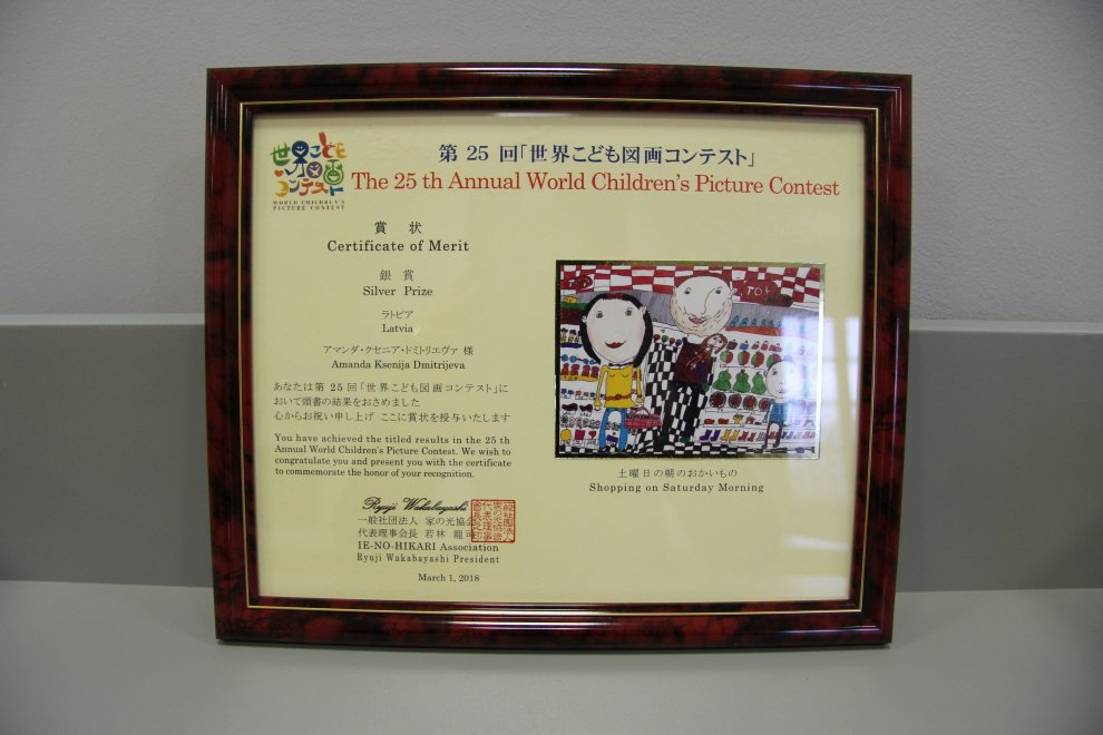 26. aprīļa ceturtdiena Dundagas Mākslas un mūzikas skolā iesākās ar priecīgām ziņām — saņēmām sūtījumu no Japānas. 25. Starptaustiskajā Pasaules bērnu zīmējumu konkursā, ko rīko asociācija IE-NO-HIKARI, Dundagas Mākslas un mūzikas skolas 1. klases audzēkne Amanda Ksenija Dmitrijeva ieguvusi Sudraba godalgu ar 8 gadu vecumā zīmēto zīmējumu «Iepirkšanās sestdienas rītā». Amandas skolotāja ir Dace Čodera.