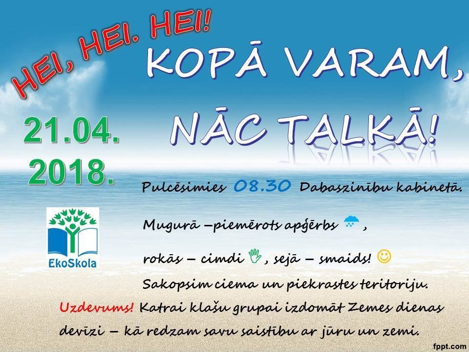 Hei, hei. Hei! Kopā varam, nāc talkā! 21. aprīlī plkst. 8.30 pulcēsimies dabaszinību kabinetā!