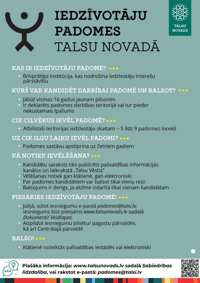 No 16. jūlija līdz 27. augustam Talsu novada pašvaldība aicina pilsētu un pagastu iedzīvotājus uz tikšanās ciklu un dialogu par iedzīvotāju padomju izveidošanu un to darbības mērķiem. Tikšanās laikā iedzīvotāji tiks ne tikai informēti par padomes darbības principiem un mērķiem, bet katrā tikšanās reizē būs iespēja arī pašvaldības pārstāvjiem uzdot visus interesējošos un neskaidros jautājumus saistībā par iedzīvotāju padomēm novadā.